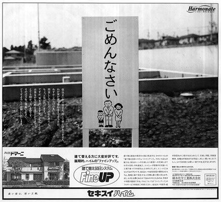 工場でほとんどを生産するセキスイハイムの住宅は現場工期が短く、仮住まいの期間も短いため、建て替えるお施主様にはいろんなことが好都合。しかし、お施主様には大変良いことでも、現場工事や仮住まいなどに関係する方々にとっては、良いことばかりとは言えません。今までなかった画期的な工法を「ごめんなさい。」というコンセプトワード的キャッチフレーズを使って表現しました。